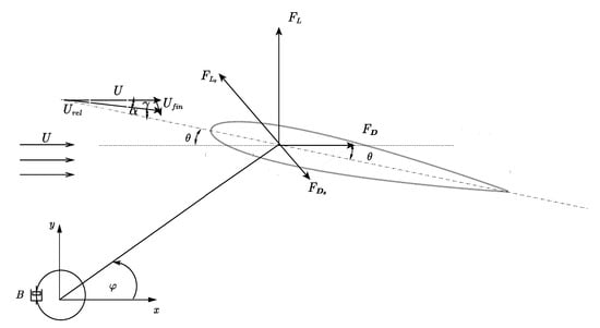 acting in the tangential direction with denoting the corresponding unit vector (see Figure 2). On the other hand, the self-pitching motion of the foil is taken into account for the formation of the angle of attack, and results in the change of the effective angle of attack of the flow relative to the foil is given by: