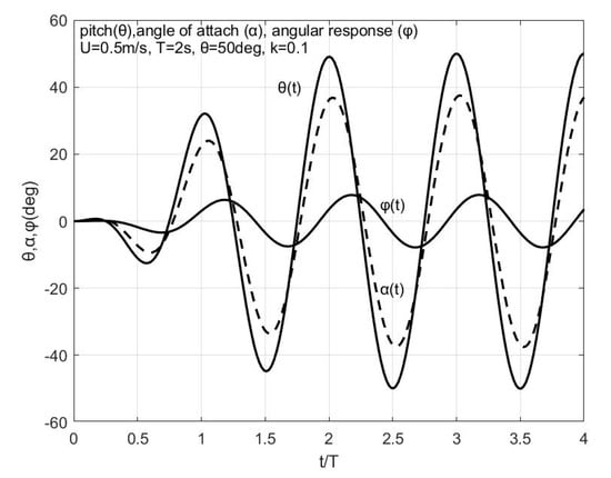 In Figure 4, the response of the system was illustrated, as calculated by the present method. Results are obtained by considering no spring constant (C = 0) and a dimensionless damping coefficient , as reported in []. More specifically, the time history of the angle of attack and the enforced self-pitching angle are shown, for onset flow speed m/s, and reduced frequency . It is observed in Figure 4 that the amplitude of the response is calculated to be , and the corresponding amplitude of the effective angle of attack is found to be The predictions by the present model are very close to the experimental data which are reported to be: ; see Figure 3(a) and Figure 4 of reference [].
