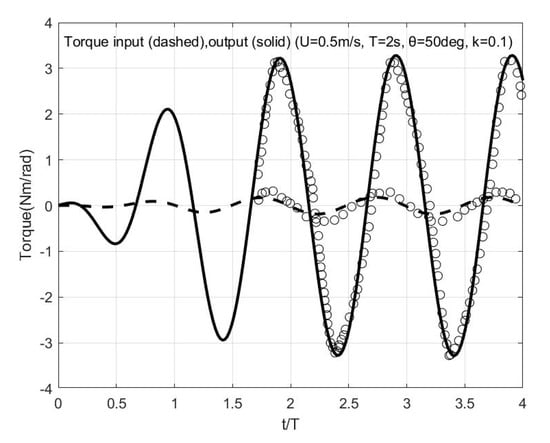 Moreover, for the same as before case, the output and input torque are depicted in Figure 6 for the case of reduced frequency and pitching amplitude . The maximum output and input torque are 3.28 Nm/rad/sec and 0.18 Nm/rad/sec, respectively, and they are quite good compared with the experimental data by [] (indicated by using symbols).