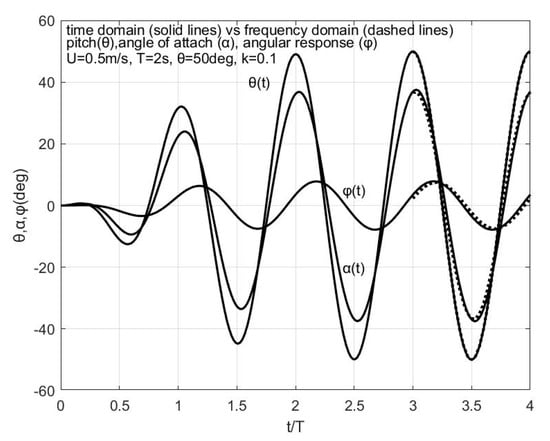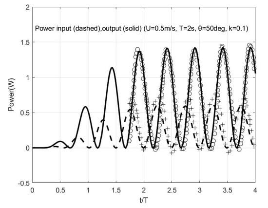 First, for the device operating in a uniform stream m/s, and the foil (with dimensions and geometrical parameters as above in Section 3) oscillating at reduced frequency with self-pitching amplitude , in Figure 11 the effective angle of attack and the angular response of the system are presented, as calculated from the present time-domain model using solid lines and from the linearized frequency domain model by using dashed lines, respectively. The corresponding comparison concerning the input and output power of the device as a function of time is presented in Figure 12. The results show very good agreement indicating that the simplified frequency domain model can provide very good predictions, at least for the cases of geometrical data and operating conditions, where the omitted non-linearities do not expect to have strong effects.