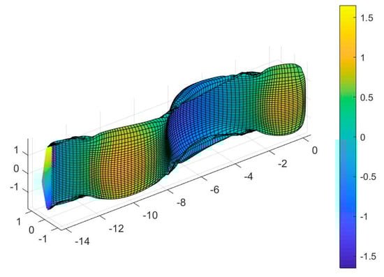 Plots concerning the vortex wake development downstream the oscillating wing, as calculated by the vortex element method using free wake analysis, staring from rest and enforcing the kinematic conditions due to the combined oscillatory motions heave (in the transverse direction) and self-pitching motion, are shown in Figure 8 and Figure 9. In particular, in Figure 8 the wing with rectangular trapezoidal planform shape with aspect ratio AR = 3.40 corresponding to the configuration by Huxham et al. [] is considered, and in Figure 9 the corresponding wing with trapezoidal planform area and same main dimensions, but with a leading edge swept angle Λ = 70°, leading to increased aspect ratio AR = 5, and about 42% reduced wing planform area, is shown. The midchord length of both wings is the same c = 0.1 m, as well as the span which is 0.34 m. The intensity of the vortex rings in the wake is illustrated by using color plots. We observe in these figures that the effect of vortex sheet separation from the tips is reduced in the case of the swept back wing which, in conjunction with the increased aspect ratio, leads to increased lift coefficient.
