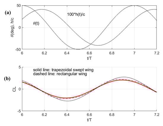 Calculated history of lift coefficient for 3D wings (rectangular, swept back). (a) Enforced oscillatory transverse (heave) motion h/c and self-pitch θ motion corresponding the data of Figure 4. (b) Calculated CL coefficient from 3D vortex element method for rectangular (dashed line) and trapezoidal swept-back wing (solid line), and comparison with the prediction by the present semi-3D model Equation (4) shown by using red line.