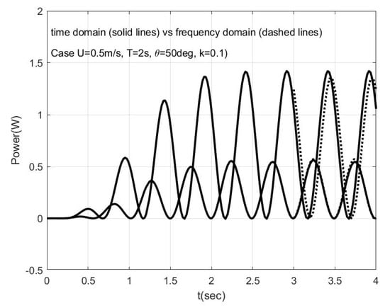 In the case examined the dimensionless heave amplitude is h/c = 0.39, and is found to be a little smaller than the time-domain prediction but still in good agreement with the experimental data provided in []. Also, the amplitude of the effective angle of attack is found to be which is a little smaller than the value obtained by the present time domain simulation. Similarly, the amplitude of the response of the system is found to be and by the frequency and the time domain analysis, respectively, and the above justify also the small differences observed in the power calculations presented and compared in Figure 12. In the case examined the results obtained by the time domain model are closer to the experimental data, as reported in the work by Huxham et al. [].