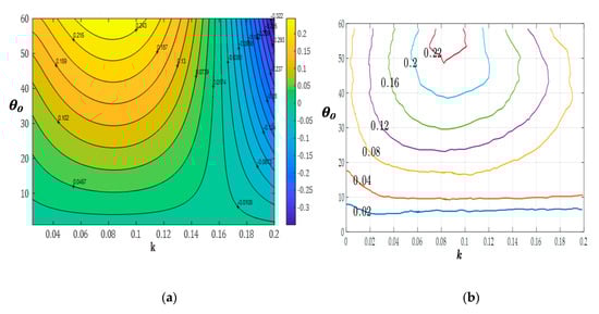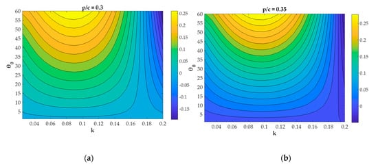 Following this remark, in the sequel a parametric study of the device is undertaken, and results are presented and discussed concerning the effect of the location of the pivot axis for the self-pitching motion of the foil and for the same value of the damping coefficient modelling the PTO. In Figure 15, a contour map of efficiency is presented as function of the reduced frequency and the pitching amplitude for two other locations of pivot axis at (Figure 15a) and (Figure 15b). It is seen that good efficiency is achieved for a range of reduced frequencies k = 0.06–0.11, and the maximum performance is calculated to be 26.5%, as in the case presented in Figure 14. Moreover, the positioning of the pivot axis is preferably set at a distance of about 35% of the chord from the leading edge. The small increase of performance for this value of the pivot axis is attributed to the small reduction of input power required due to the corresponding reduced moment for p/c = 0.3–0.35, which is probably closer to the center of hydrodynamic pressure of the foil in this case for the system in operating conditions around the optimal values.