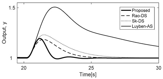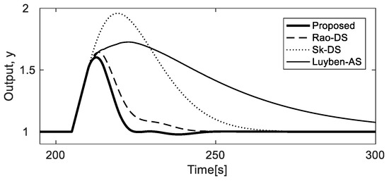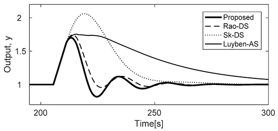 This can also be confirmed by the quantitative results shown in Table 4 and Table 5, where the IAE values are smaller in the order of the proposed method, Rao-DS, Sk-DS, and Luyben-SA. Therefore, the proposed method has the best response and Luyben-SA has the worst.