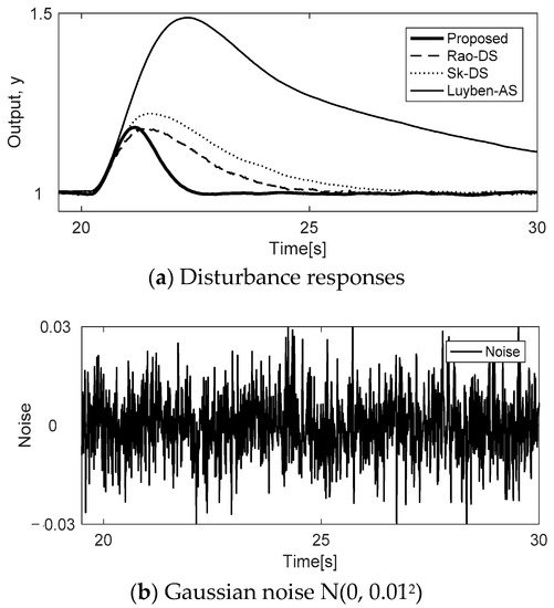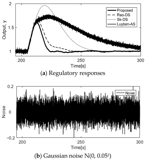 The output is perturbed by an additive white Gaussian noise component N(0, 0.012), as shown in Figure 13b. As shown in Figure 13a, the proposed method shows satisfactory responses even if there is a measurement noise. This can also be confirmed by the quantitative results shown in Table 10, where the IAE values are smaller in the order of the proposed method, Rao-DS, Sk-DS, and Luyben-SA.