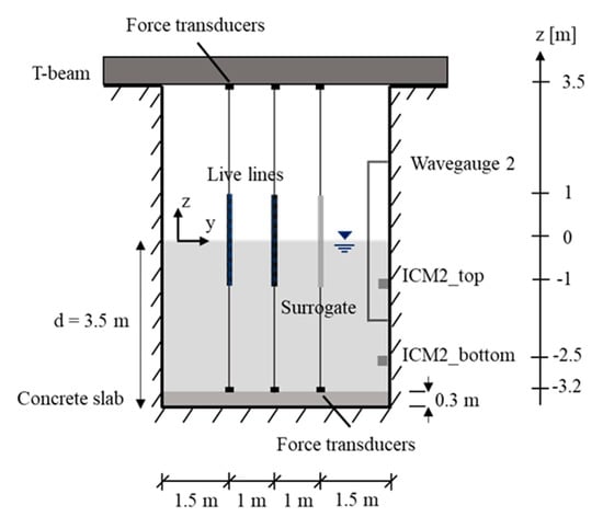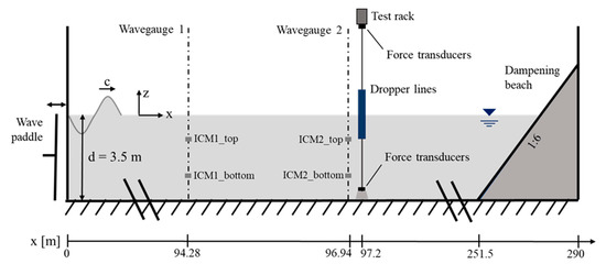 Incident wave conditions are measured in close vicinity to the dropper lines by two wave gauges and four inductive current meters. All wave gauges are attached to the South wall of the flume. The wave gauges are wire type wave gauges based on combined electrical resistance and capacity technique and consist of two electrodes, a measuring wire and a ground plane, with an accuracy of ±1 mm. The sampling rate is set to 100 Hz. Wave gauge 1 is positioned in a distance of 94.28 m to the idle position of the wave paddle, and wave gauge 2 is positioned in a distance of 96.94 m corresponding to a distance of 2.92 m and 0.26 m to the test rack, respectively. Right next to these two wave gauges, two inductive current meters (ISM-2001F, hs engineers, Hannover, Germany) are positioned each in different heights so that water particle velocity u and v in x- and z-direction is acquired at four spots, twice in a distance of 2.92 m (ICMs1) and twice in a distance of 0.26 m (ICMs2) to the test rack as well as 0.31 m to the wall of the flume. Velocity in y-direction is assumed to be negligible which is proven by evaluating measured force in y-direction. The lower current meters (ICMs_bottom) are located at a height of 1 m above the flumes bottom each, while the upper current meters (ICMs_top) are attached in a height of 2.5 m, corresponding to 2.5 and 1 m below water surface, respectively. The current meters have a nominal velocity range of ±3 m/s and a measuring accuracy of ± (0.5% reading + 0.5% limit range). The sampling rate is set to 100 Hz. All testing is recorded by a GoPro Hero4 with a high-definition resolution and a sample rate of 100 fps.