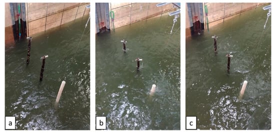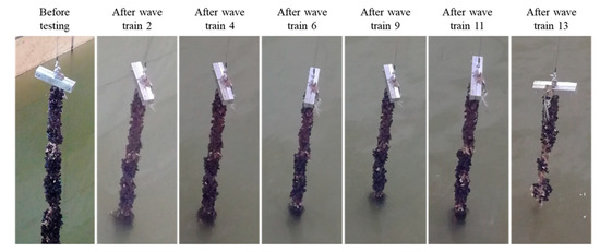 During the experiments, drop-off of individual mussels and groups of mussels is observed. Minor loss is observed after wave train 9, and strong loss is observed after wave train 11. After wave train 13, approximately two-thirds of mussels are lost. A photo documentation of the mussel drop-off process is depicted in Figure 6, with a sequential loss with increasing experimental time. Exemplarily, four mussel dropper lines were weighted after exposure to all wave trains. Minimum drop-off weight was 71.4% and maximum 88.1%, resulting in a mean weight loss of 67% for this small sample, throughout thirteen wave trains with thirty waves. Since only equivalent diameter before testing could be applied in the evaluation, an overestimation of the force coefficients might be present for high KC numbers. The mussel drop-off is hypothesized to occur as the blue mussels may have got into a state of stress through the increase of water temperature, external force increase and freshwater conditions.