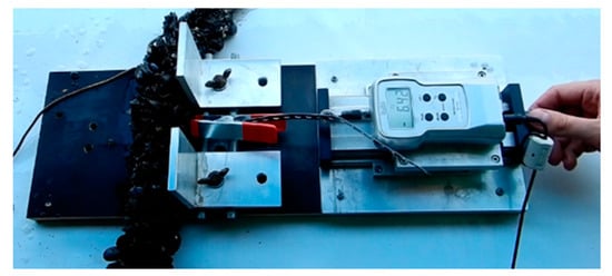 The remaining parts of the original blue mussel lines (cutoffs) are used in pull-off tests, to determine maximum attachment strength of single mussels, to help and provide new data on the tested shellfish individuals under experimental conditions in large-scale testing. Adhesive forces are measured with a FMI-100B5, by Alluris, with nominal range 50 N, measuring accuracy ± 0.2% at 23 °C, resolution 0.01 N and sampling rate 1000 Hz. Figure 5 shows the procedure: the device pulling at a single mussel by backward motion on a carriage, controlled by a rotary screw for repeatability. The display of the force gauge is recorded with a Nikon Coolpix L810 with a sampling rate of 25 Hz. The recordings are evaluated, frame by frame, for time histories of adhesive force, as well as maximum force. Individual mussels that were pulled off are additionally selected for data acquisition of length, height and width (Figure 3b). The sample is evaluated with descriptive statistics parameters. Outliers are defined as values which are more than 1.5 times of the interquartile range above the third quartile or below the first quartile and are removed from the dataset, to obtain the statistic parameters.