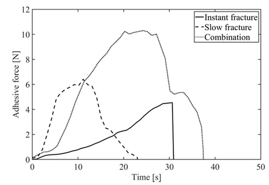 The evaluation of the camera recordings of the pull-off tests showed varying failure mechanisms. Three classes are suggested to cluster the observed failure mechanisms more methodologically: slow, instant and mixed fracture. Examples of equivalent measured force time histories are depicted in Figure 8. A slow failure mechanism is characterized as slow drop to zero after measured force is reaching its maximum, interpreted as the yield strength of the byssus material. It is assumed that only single byssus threads or small groups thereof tear at a time while the remaining, intact threads continue to withstand. In contrast to that, an immediate force drop towards zero is defined as instant fracture. Presumably, all threads tear quasi-simultaneously after reaching the maximum adhesion force by yielding. In the depicted cases in Figure 8, measured force drops to zero within 0.5 s for the instant failure and within 12 s for the slow break. The last class is a combination of the slow and instant fracture, where either a fast force drop is followed by a slow decrease to zero or vice versa. In the 82 pull-off tests, 39 slow, 26 instant and 17 mixed failures were observed. The results of the camera recordings go in line with previous results of [65], who describes the yielding of threads as the essential ability to recruit threads of different length for higher attachment strength.