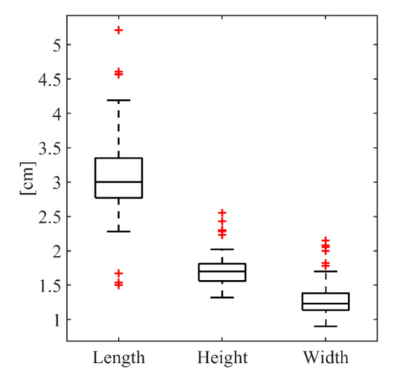 Figure 9. Box plot for length, width and height of individual mussels in a sample of 82 mussels; outliers are marked as red crosses.