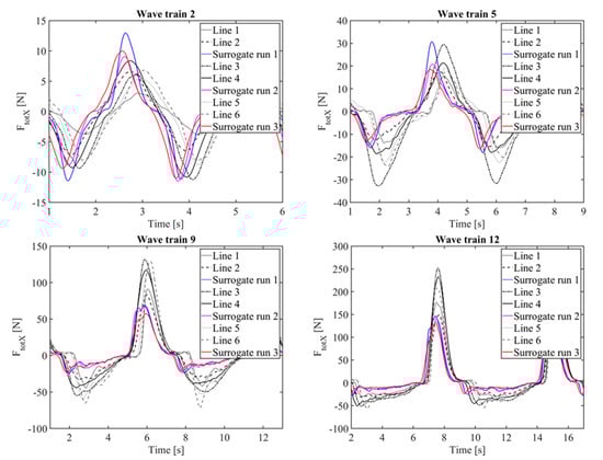 Figure 10. Time history of total force in x-direction for example wave cycles of trains 2, 5, 9 and 12.