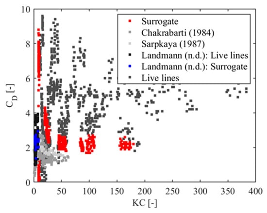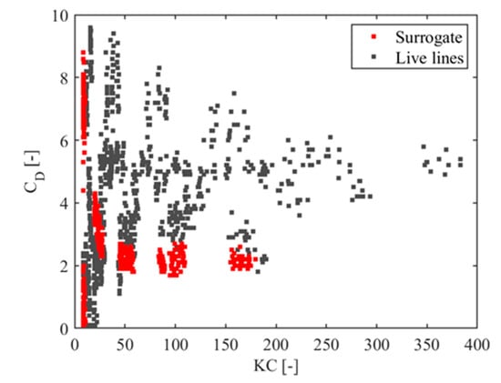 Figure 11. Drag coefficients related to the Keulegan–Carpenter (KC) number for the live lines and the surrogate.