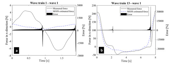 Figure 12. Force time histories of example wave cycles, comparing measured and MOJS approximated force in x-direction for line 3, (a) wave train 1 and wave 1, and (b) wave train 13 and wave 1.
