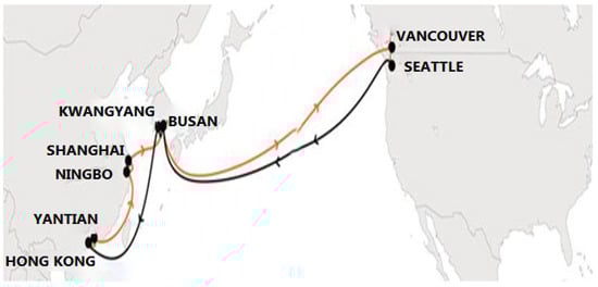 This study assumes that the Vessel U navigates east from Hong Kong via Yantian port (in China), Busan (in Korea) to Vancouver (in Canada) and Seattle (in America), and then returns to Hong Kong. The schematic diagram of the ports on the ship route is shown in Figure 1. The round voyage is about 12,229 NMs (Nautical miles), 1 NM = 1.852 km. For example, the distance from Kwangyang to Hong Kong is 1140 NMs and that from Hong Kong to Yantian is 59 NMs.