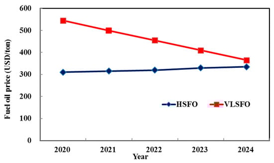 The VLSFO price fluctuates with the international crude oil price and marine fuel oil price. The carriers generally forecast the future oil prices according to reliable information. This study uses the oil prices of HSFO and VLSFO during 2020 to 2023 forecasted by Drewry [], as shown in Figure 2 as the yearly prices (USD/ton) of HSFO and VLSFO in the 5 years after the compliance strategy is implemented. Drewry [] inferred that in the next five years, the price of HSFO will rise slowly year by year, but the price of VLSFO will fall rapidly. Hence, the price difference between the two fuel oils will be reduced gradually.