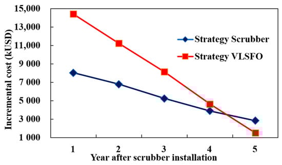 Figure 2 shows the estimated international oil price variation; the VLSFO price falls year by year, but the HSFO price rises. In consequence, the price discrepancy between the HSFO and VLSFO decreases rapidly. Therefore, the total incremental cost decreases from 14,403 kUSD in the first year to 1492 kUSD in the fifth year, which is only 10% of the first year.