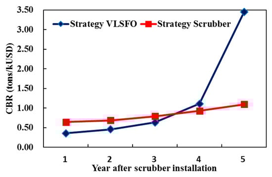 - The Strategy Scrubber has higher cost-benefit ratio than Strategy VLSFO at the first 3.3 years after the strategy implementation. The trend of the cost-benefit ratios is then reversed and the difference of the cost-benefit ratios between those two strategies increases year by year.