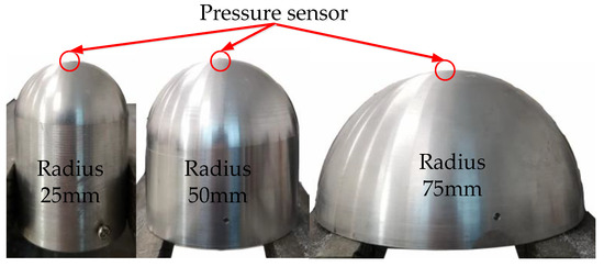 The boundary structure was composed of three oblique 45 degree hemispherical structures with different radii and one oblique 45 degree flat plate structure. They were all made of aluminum alloy. The radii of the hemispherical structure were 25, 50, and 75 mm. The flat plate structure had a radius of 125 mm and a thickness of 10 mm. We drilled M10 × 1.0 threaded holes in the center of the hemispherical structure and used the flat plate structure to install the pressure sensor.