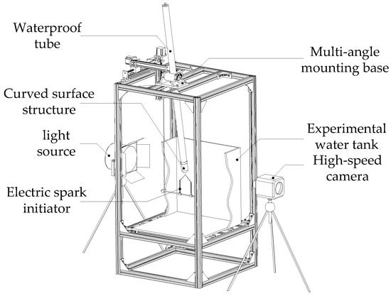 Both the electric spark bubble generator and the pressure measuring surface of the curved surface boundary structure model were placed at the center of the experimental water tank. The maximum diameter of electric spark bubbles generated in the free field was 60 mm. Because of the large volume of the experimental water tank, the possible boundary effect of the water tank boundary could be ignored. The diameter of the electrode used in the experiment was 0.5 mm, and its influence could be ignored compared to the bubble volume. Therefore, in this experiment, only the boundary structure could affect the bubble dynamics. The exposure speed of the camera was 2.41 μs. The time for the electric spark bubble to end in the second pulse was about 10.343 ms. The exposure speed of the camera was much smaller than the spark bubble pulsation time. The error was small enough. The focal length of the high-speed camera was at the intersection of the electrodes and the midpoint of the curved surface boundary structure. In this way, the whole process of the effect of the electric spark bubble pulsation process on the oblique 45-degree curved surface boundary structure could be captured better.