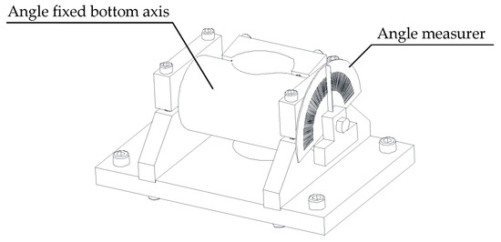 A multi-angle mounting base was applied to the experimental setup to measure the electric spark bubble pulse load on an oblique 45-degree boundary. One can see the electric spark bubble dynamics near the oblique 45-degree boundary. A waterproof tube was placed in the angle-fixed bottom axis. One can adjust the angle-fixed bottom axis so that the angle measurer points to 45 degrees. In this way, the center line of the waterproof tube was at 45 degrees from the vertical because the center line of the waterproof tube coincides with the center line of the boundary structure. The multi-angle mounting base is shown in Figure 5.