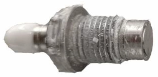 In this experiment, the Phantom VEO 710 high-speed camera shot electric spark bubbles at a speed of 24,800 frames/s. At this time, the image rate of the high-speed camera was 512 × 512. The exposure speed of the camera was 2.41 μs. The time for the spark bubble to end in the second pulse was about 10.343 ms. In other words, during this period, the high-speed camera took approximately 248 photos. In order to avoid the LED lightbulb image appearing in the pictures taken, in this experiment, frosted glass was installed between the lamp and the experimental water tank. This experiment used a CY-YD-205piezoelectric pressure sensor, abbreviated as 37311. The pressure measurement range was 0‒100 MPa, and the overload capacity was 120%. The sensor is shown in Figure 6. The spark bubble generator and curved surface boundary structure model were placed in the experimental water tank. The experimental water tank was a glass cube with a side length of 1 m. The experimental water tank was fixed on the bracket to prevent it from moving during high-voltage discharge.