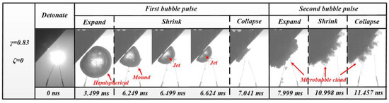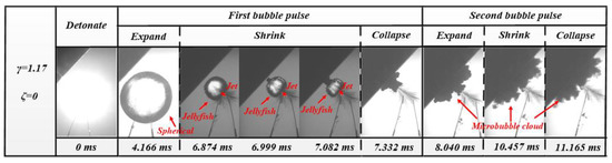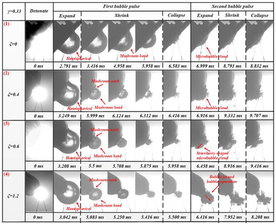 Figure 7(1) shows the bubble pulsation process when ζ = 0 and γ = 0.33. At this time, we used a flat plate structure. When t = 0 ms, a dazzling light was emitted from the intersection of the electrodes, which was the beginning of the high-voltage discharge. Since the explosion source was close to the flat plate structure (10 mm), the expansion of the bubble in the first cycle was completed along the surface of the flat plate structure. At this time, the bubble presented a hemispherical shape, as shown by t = 2.791 ms. In the contraction process of the first cycle of the bubble, the bubble began to appear mushroom-shaped. When t = 4.958 ms, the shape of a mushroom head could be seen. However, at this time the mushroom neck was still difficult to observe. The bubble collapsed at t = 6.583 ms. This marked the end of the first pulse cycle of the bubble. Except for the microbubble cloud attached to the plate during the second pulsation of the bubbles, no other special phenomena existed. The high-speed camera did not capture the jet phenomenon during the entire bubble pulsation process. When t = 0 ms, a shock wave was generated. When t = 7.499 ms, the first pulsation load of bubbles was generated. When t = 6.583 ms, the second pulsating load of bubbles was generated.