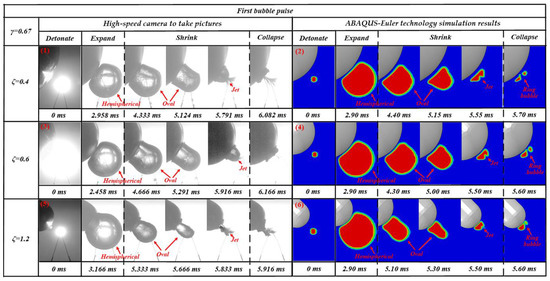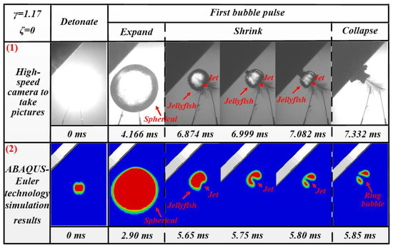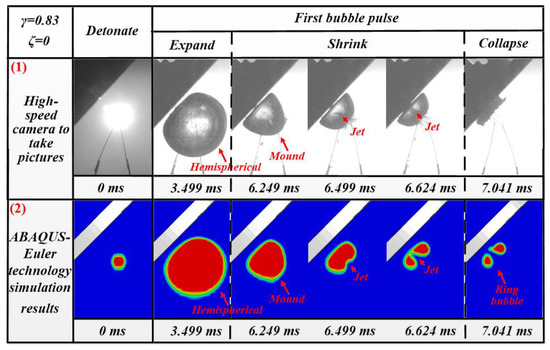 Comparison of experimental results and simulation results. (1) The pulsation diagram of the first cycle of the bubble taken by a high-speed camera. (2) The pulsation diagram of the first cycle of the bubble simulated by ABAQUS/Explicit.