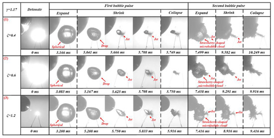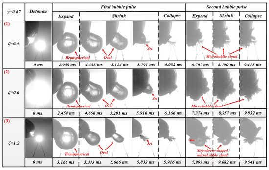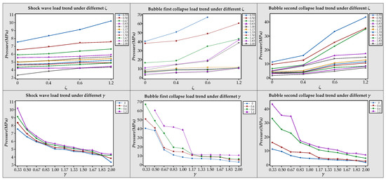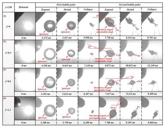 It was found through the experiments that the bubble shape change and the load change near the oblique 45-degree boundary mainly depended on ζ and γ. When both are variables, the situation becomes extremely complicated. Therefore, we explored the law of bubble pulsation when another variable changes, while controlling one variable. The specific experimental numbers are shown in Table 3. We found that different ζ and γ combine with each other, and a total of six different bubble pulsation forms can occur. See Table 3 for details.