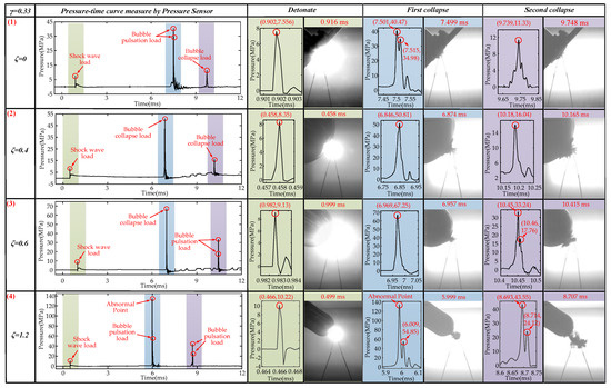 Figure 7(4) shows the bubble pulsation process when ζ = 1.2 and γ = 0.33. At this time, we used a hemispherical structure with a radius of 25 mm. Compared with ζ = 0.6, the mushroom shape of the bubble in the first cycle of contraction was more obvious. When t = 5.083 ms, the head of the mushroom was smoother and rounder, and the neck was longer. In the expansion phase of the second bubble pulsation cycle, the bubble jet and bubble separation phenomenon obviously occurred in the lower right. There were two reasons for this phenomenon: ① The contact surface of the boundary structure was reduced, which reduced the Bjerknes adsorption force; ② the load generated when the bubble collapsed produced a reaction force on the bubble, which prompted the remaining bubbles to move in the opposite direction of the boundary structure. The results of the high-speed camera showed that there was no obvious jet flow during the bubble pulse. When t = 0 ms, a shock wave was generated. When t = 5.5 ms, the first pulsation load of bubbles was generated. When t = 8.208 ms, the second pulsating load of bubbles was generated.
