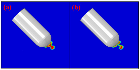 Using the ABAQUS/Explicit simulation results to simulate the first pulsation period of the bubble is shown in Figure 12(2). When t = 0 ms, bubbles started to form. When t = 2.90 ms, the simulated bubble expanded to the maximum. At this time, the simulated bubble became spherical. When t = 5.65 ms, the simulated bubble shrank into a jellyfish shape. When t = 5.65 ms, the simulated bubble started to produce a jet. When t = 5.75 ms, the jet was already very obvious. When t = 5.80 ms, the jet passed through the bubble and reached the other side. When t = 5.85 ms, the first pulsation period of the simulated bubble collapsed, and the generation of annular bubbles could be seen.