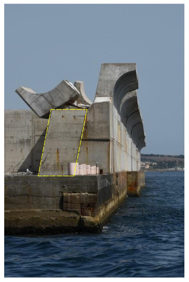 In the recent past, several breakwater parapet failures have been observed. Damages occurred for example in Pico Island (Azores, Portugal) [11] and in Strand (South Africa) [12,13] both characterized by a recurved wall. Typically, this type of failure occurs due to breaking waves interacting with the top of the wall. The waves are then blocked and deflected offshore leading to rather high impulsive wave pressures. Recent experimental investigations of breaking waves interaction with seawalls characterised by a horizontal cantilever slab were carried out by Kisacik et al. [14,15], while Ravindar et al. [16] investigates the loading of breaking waves on parapets with a recurve. Generally, it has been observed that under breaking wave conditions, the maximum impulsive pressure is located near the Sea Water Level (SWL). Whereas for non-breaking wave conditions the maximum impulsive pressure is reached near the tip of the recurved parapet [17,18]. Another example of such a failure is shown in Figure 1 which occurred in Civitavecchia Harbor, Italy. A storm event that happened on 22 November 2015 resulted in the complete overturning of some of the concrete parapets. The remarkable aspects of this failure are—(i) the structure was a relatively new construction and (ii) no waves broke on the structure due to the large water depth around 25 m at the toe of the breakwater, rendering its study rather interesting. Indeed, the impact pressure was induced by a non-breaking wave that hits the overhang of the structure. This phenomenon has been called Confined-Crest Impact (C-CI) [18]. In this case the maximum impact pressure acts at the top part of the recurved parapet, possibly inducing an even more detrimental loading condition for the rigid parapet structure. Interestingly, Figure 1 shows that only some of the parapets failed, but the underlying reasons are unclear. No concrete quality inspection results, that is, coring, are available and therefore it is not possible to certainly say if this was the leading process. However, from a visual inspection, intensive corrosive concrete cover breakdown has been observed. Moreover, 3D effects can be excluded a priori because the wave direction is usually orthogonal to the structure. Hence, it can only be speculated that the leading reason for the failure was the poor, non-homogeneous, quality of the concrete.