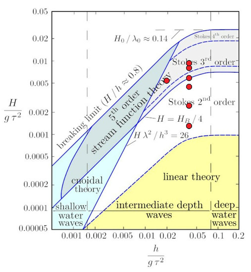 Wave theories validity fields according to Le Méhauté [30]. Red dots represent the wave states.