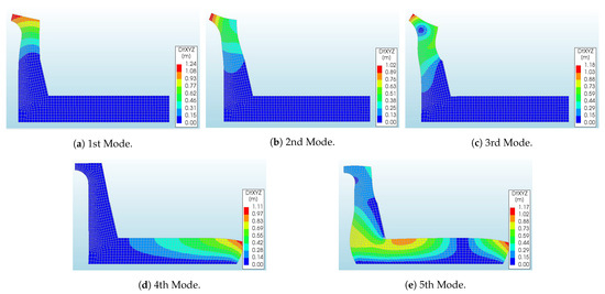 The main results are presented in Table 4, Table 5 and Table 6 for the x-direction, that is, positive x is directed from offshore toward the coast. The 4th and 5th modes are clearly dominant, due to the involvement of the horizontal bottom slab leading to the larger EMPF. However, looking at the 4th and 5th modal shapes (Figure 5d,e), the involved part of the structure is not directly affected by the wave load, hence the 4th and 5th modes will not massively respond to the incident wave load. The 1st mode is the dominant one for the vertical part of the crownwall and also likely to be the modal shape (Figure 5a) that triggers the investigated failure mechanism due to its relatively large EMPF. Moreover, by comparing the values presented in Table 4, Table 5 and Table 6, it is evident that the concrete classes partially affect the dynamic behavior of the overall structure. The natural frequencies, as expected, decrease with the decreasing of the concrete quality, whereas the effects on the EMPF are minimal.