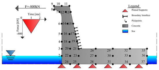 The purpose of this analysis is to identify which natural mode is dominant within the structure, which also describes which mode should have the largest effect on the response to the impulsive wave load. A virtual impact hammer test is performed to this scope. The top part of the crownwall is subjected to a time-varying triangular impulsive horizontal force with a peak value equal to 800 kN and a duration equal to s (Figure 6). After the virtual hammer impact, the structure is let free to vibrate while recording the displacements along the x-direction of 37 different control points on the structure for the following s, Figure 6. Then, through a standard frequency analysis, for each of the recorded displacement time series the first five dominant modes are defined as the high-energy peaks (Figure 7). The dominant mode for every control point is defined as the one corresponding to the frequency with the highest energy. Due to the negligible effect of the concrete class on the overall dynamic behavior of the structure only C35/45 concrete class is taken into account for this analysis. The example energy spectra resulting from the aforementioned procedure are provided in Figure 7 for control points 8 and 30, while the identified natural frequencies are highlighted with vertical green lines.