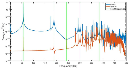 Energy spectrum of the displacement time series analysis for control point 8 (blue), control point 30 and the identified structure modal frequencies (vertical green lines).