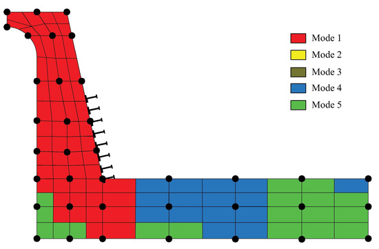 Figure 8 summarizes the results of the analysis, while a more detailed numerical description is provided in Appendix A. It can be observed how the 1st mode dominates the dynamic behavior of the entire vertical part of the crownwall protruding its effect also within the frontal part of the horizontal slab. The 4th and 5th modes are only relevant within the second half of the horizontal slab, confirming their relatively weak influence on the overall structural response under dynamic wave loading. The lower left corner of the structure seems to be slightly more affected by the 5th mode than the rest of the frontal surface of the structure. However, this area is not relevant for the response to the dynamic wave loading due to the larger stiffness of the structure at this location compared with the vertical cantilever part. As expected, due to associated small values of EMPF, the 2nd and 3rd modes are not relevant for the dynamic response of the crownwall under wave action.