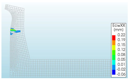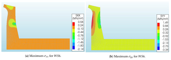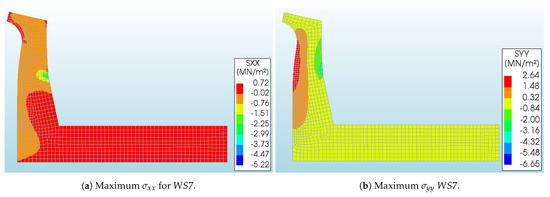 A transient dynamic analysis with linear material properties is performed to identify the stress distribution and to define which of the two wave states produces the maximum stress value in the crownwall so that it can later be investigated via the non-linear analysis. The impulsive nature of the wave loadings presented in Figure 4 imposes the adoption of a rather short time step to properly capture the dynamic response of the crownwall under such fast-varying time load. Therefore, a varying time step is applied ranging between the minimum value equal to s and the maximum value s for the impulsive and quasi-static parts, respectively. The linear analysis is performed to investigate normal stresses in both the x (horizontal) and y (vertical) direction, that is, and . The maximum stresses are what eventually is going to lead to the failure of the structure, therefore identifying the maximum peak pressures is important for defining the worst loading case. The analysis is performed for the concrete class of , and for both wave states WS6 and WS7. The only variable that changes and affects the results of the linear analysis is Young’s elasticity parameter (), equal respectively to GPa, GPa and GPa. The main results in terms of maximum and values are presented in Table 7 and Table 8.