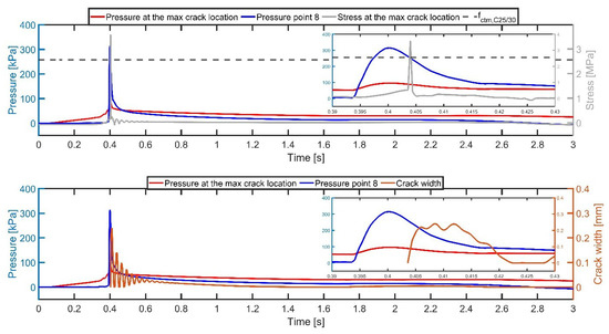 The analyses are performed accounting for all the above mentioned concrete classes, however, as expected only C25/30 leads to the development of cracks and therefore to the failure of the structure. The results regarding the location of the developed cracks are shown in Figure 11, while in Figure 12 top panel, the pressure (red line) and stress (grey line) time series at the point of the calculated maximum crack are overlaid with the pressure time series imposed on control point 8 (blue line) and the tensile strength of C25/30 (, dark grey dotted line). In Figure 12 bottom panel, the same pressure time series are overlaid with the time evolution of the crack width (orange line), so that a full overview of the processes leading to the structure failure can be captured.