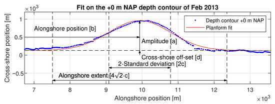 In Equation (1), a is the cross-shore extent with respect to the isobath further alongshore, b is the alongshore position of the maximum cross-shore extent (mean), c is a measure for alongshore extent, and d is the cross-shore off-set from the reference line. The alongshore and cross-shore coordinates are given by x and y, respectively. The cross-shore extent of the nourishment’s isobath from the reference line is given by , while the alongshore extent is defined here to be equal to . For an example of such curve-fit, see Figure 4.