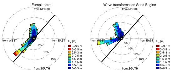 Wave climate from August 2011 to September 2016 for offshore wave station Europlatform (left) and transformation to the Sand Engine location at 10 m water depth (right). The black line indicates the average shoreline orientation.
