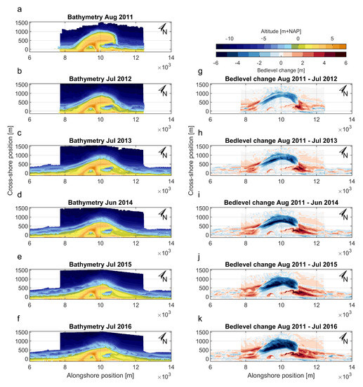 Morphological development of the Sand Engine and the adjacent coast. (a–f) In the left column altitude maps are presented for each year. (g–k) In the right column, the difference in altitude with respect to the first survey (panel a) are shown. Cold colours indicate erosion and warm colours, accretion.