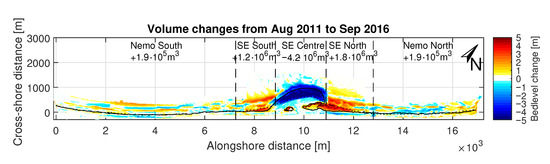 Deposition in the areas next to the Sand Engine amounts to 3.4 × 106 m3. This deposition can be further specified to 1.8 × 106 m3 just north, 1.2 × 106 m3 just south and 0.4 × 106 m3 further alongshore outside the most prominent area of sedimentation. Assuming conservation of sediment in the measurement area, ~20% of the distributed volume from the peninsula (0.8 × 106 m3) could not be traced back in the survey area. There are several potential causes to which this loss can be attributed, for which no, or only partial proof can be provided, e.g., sediment that was blown into the dunes, ca. 0.25 × 106 m3 [16], sediments transported offshore beyond the −12 m isobath and bed level lowering effects such as winnowing of fines and consolidation [15].