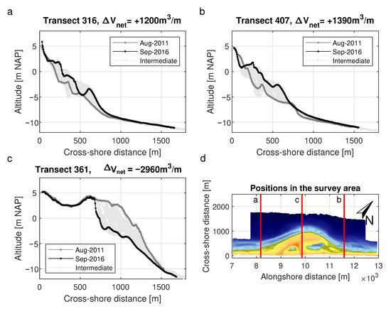 Changes in cross-shore profile shape for three distinct representative profiles. (a) Accretive area south, slope increment to ~1/65. (b) Accretive area north, slope increment to ~1/65. (c) Erosive area, slope decrease from ~1/40 to ~1/100. (d) Locations of transects in the survey area (bathymetry of February 2013).