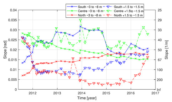 Here, alongshore averaged results are shown from three morphologically distinct sections along the peninsula: South located at 8−8.7 km alongshore, Centre at 9.3–10.6 km and North at 11–11.8 km alongshore. This gradient changes the lower slope from 1/35 to 1/67 along the central peninsula section. Meanwhile, the upper profile varies between 1/30 and 1/50 over time (Figure 13). The accreting South and North sections are situated largely outside the peninsula’s initial footprint. These areas show a rapid increase of lower profile slope together with a rapid decrease of upper profile slope in the first half year. The southern area’s shoreface steepened up to 1/33 but has reduced to 1/50 since 2015. The upper profile slope initially decreased to 1/110, but is increasing again since 2014. The northern spit exhibits a more gradual increase in lower profile slope; its slope in the upper profile rapidly changed to 1/120 in 6 months (Figure 13).
