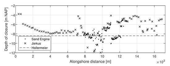 When sufficient bathymetry surveys are available in a location, the depth of closure can be determined from statistics of bed-level variability. By setting a threshold on the standard deviation of the bed-level of 0.20 m, the most offshore location with significant change is determined. The depth of closure has been identified for all transects, using statistics of the bed-level. Using the jarkus surveys from 2012–2016, this results in a derived depth of closure between −5 and −10 m NAP, depending on the location in the coastal cell (Figure 14). Comparison to the closure depth calculated from 37 Sand Engine surveys shows good agreement.