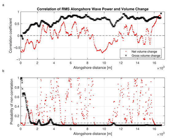 Correlations of root mean square alongshore wave power and both net and gross volume change. (a) Correlation coefficient. (b) Probability of non-correlation (p-value), dashed line indicates 95% confidence.