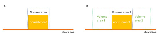 In a local approach, the efficiency of a nourishment is traditionally calculated as the volume of sand remaining within the initially nourished boundaries after certain time [3,4,39]; see Figure 16a.