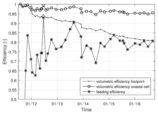 To compare both definitions, time series of both the local efficiency and the feeding efficiency are presented in Figure 17. After five years, 95% of the nourished volume (17.5 × 106 m3) is still present in the survey domain, while only 80% is present in the footprint area of the initial peninsula. The feeder efficiency appears to be low initially, then increasing and stabilising to ~80% after three years. Low feeder efficiency values in the early stages are assumed to originate mostly from measurement inaccuracies related to relatively small volume changes.