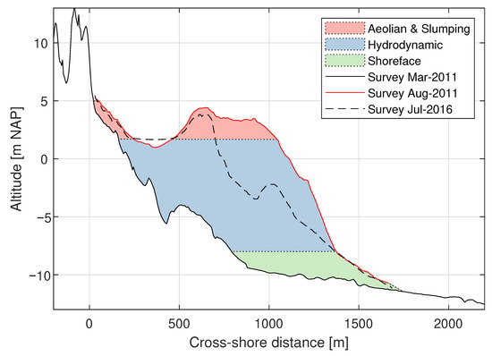 Representative cross-section of the Sand Engine peninsula, showing the pre- and post-construction surveys. March 2011: before construction, August 2011: just after construction and July 2016: after five years. Over the vertical, three zones can be discerned based on the dominant forcing mechanism. The shoreface zone (green) is below the approximate depth of closure.